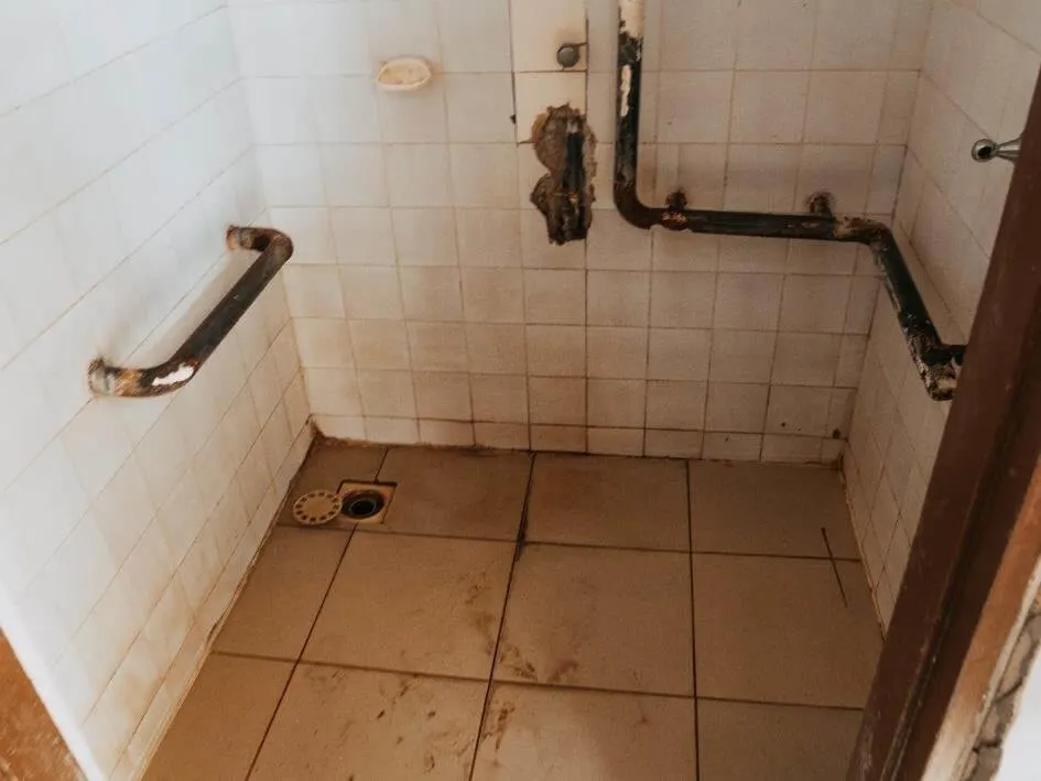 Una doccia scolastica mostra segni evidenti di deterioramento e abbandono.